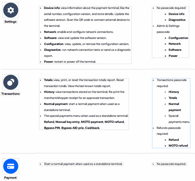 Your payment terminals have a menu with options related to payments, and a menu with options related to configuration.