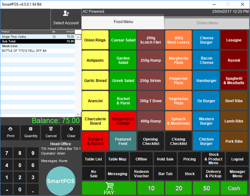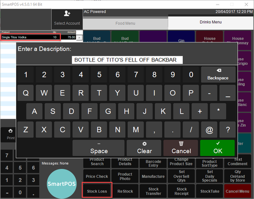 Stock Adjustments or Re-Initialisations can be entered easily in BackOffice and Wastage from the POS, using Stock Loss, can be Tracked.