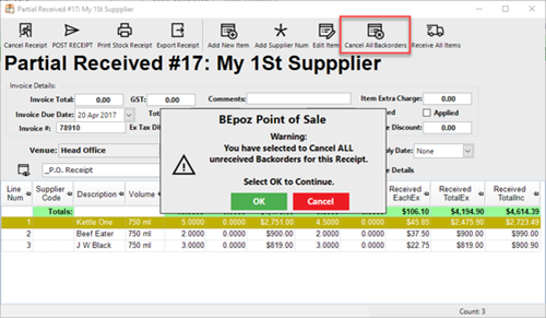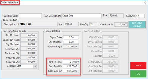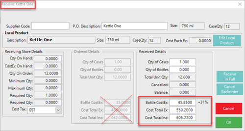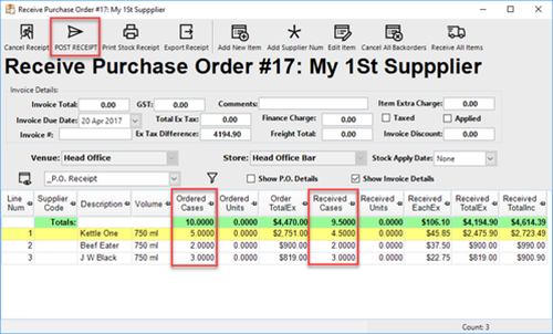 This can be time-consuming when receiving a large order, but an oversight here will carry over into post-Stocktake reporting. If you're expecting to receive 5 cases of vodka, but your supplier shorts you half a case - aside from the potential of running into a Stock shortage for a busy weekend - this must be caught and corrected before the P.O. is marked as Received and the Receipt is Posted. And then, have a nice chat with your supplier rep.