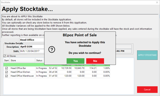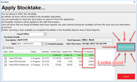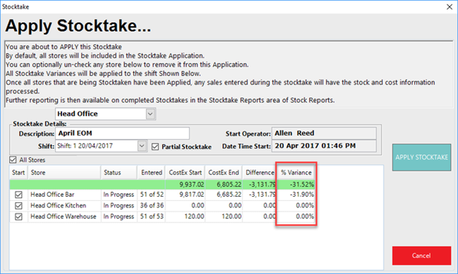 As a fail-safe, before Applying a Stocktake, the overall Variance % for the Venue and for each Store will be displayed. If it's too high for your liking (or per your Organisation's standards) - investigate!