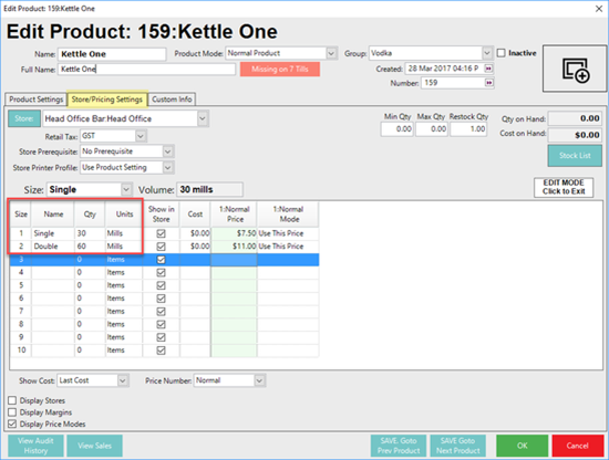 Keep in mind, that the selling Size/s can change for each Store that the Product is sold in. Maybe one of your bars sells the full bottle for table service, while others only sell a single or double pour.