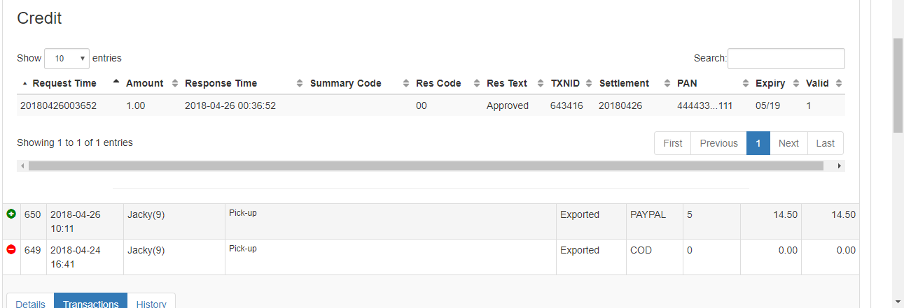 In the Transactions tab, the Back-Panel user can see the payment transaction between the Back-Panel and the PayPal account or the bank in case of credit card payments.