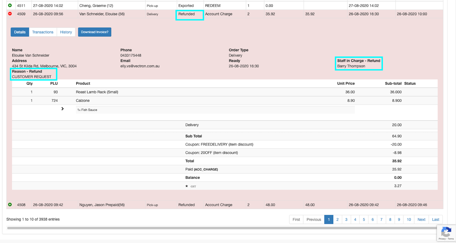 Order records displayed with a red background and the status of ‘Refunded’ in the list refer to orders that were refunded. In addition to the standard order details refunds also display the ‘Staff in Charge’ (operator who approved the refund) and a ‘Refund Reason’ (origin of the request.