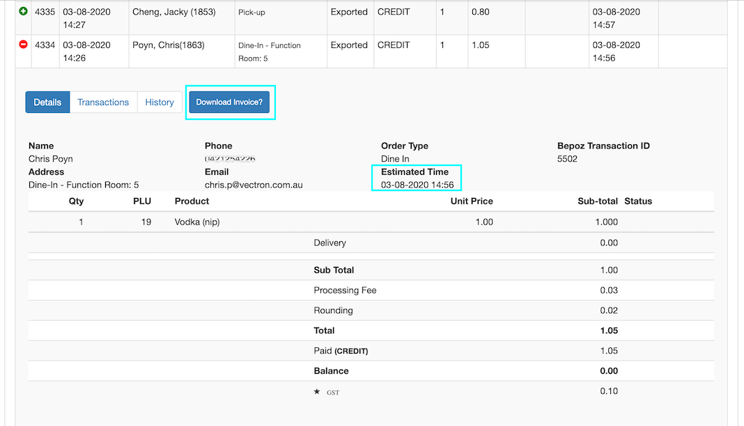 button on the left side of the row, the Order Detail tab will open. Here the Back-Panel user can download the electronic invoice, see more information about the customer who placed the order, the address this order will be delivered (in case of delivery), the date and time the order was placed, the estimated time the order was scheduled to be ready, the order itself (products, notes, condiments, add-ons), and if any promotional coupon or points were used.