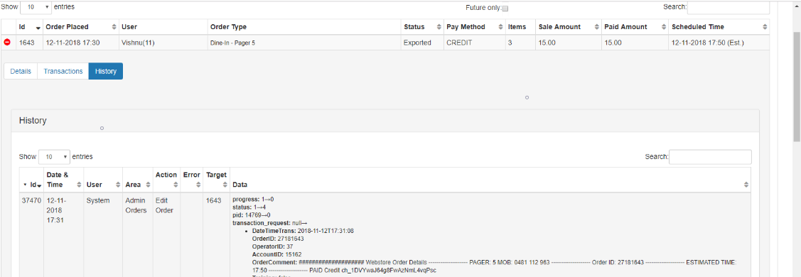 In the History tab, the Back-Panel user is able to see everything that happened to this order, the transaction times, when products were added or removed from the cart, delivery mode and fee, points used, comments and more.
