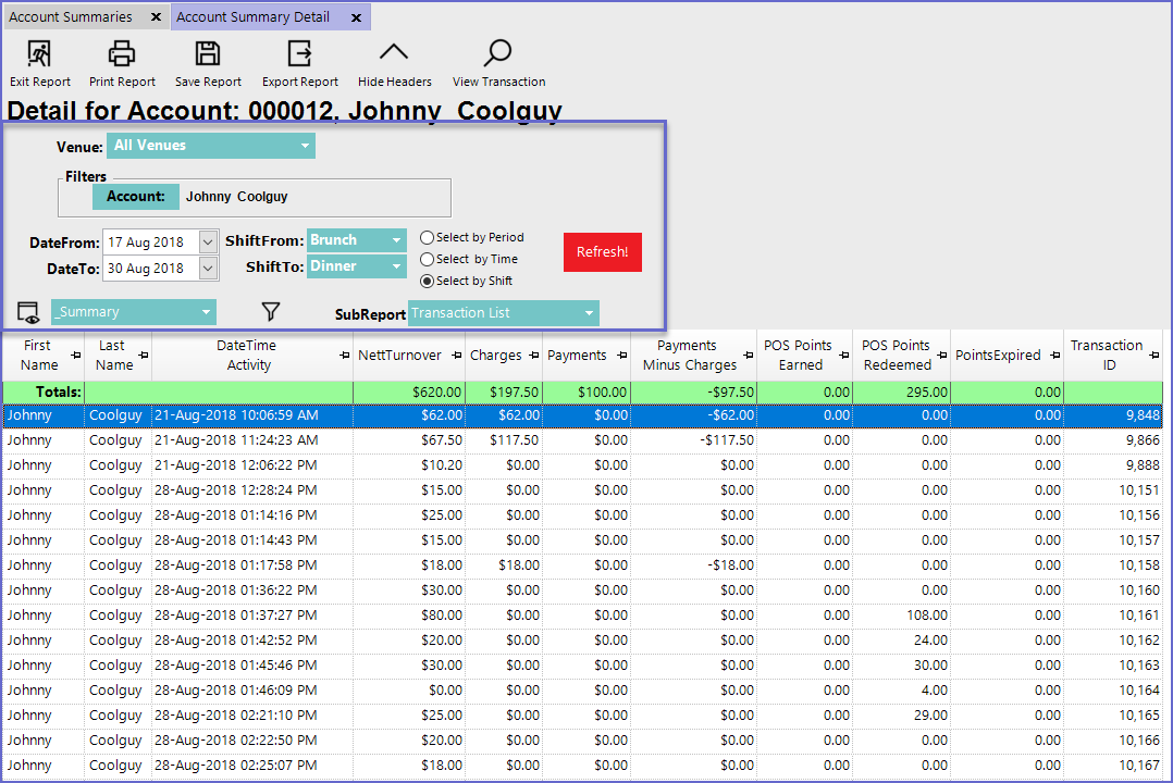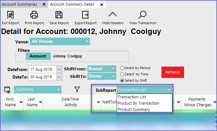 The standard Views in the Transaction List SubReport vary in focus from any membership payments, to payment, point and discount summaries, to product analysis