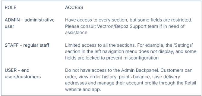 Website users can have different access permissions, which are called âRolesâ. The end-user role corresponds to customers only and this role does not have access to the Admin Backpanel.