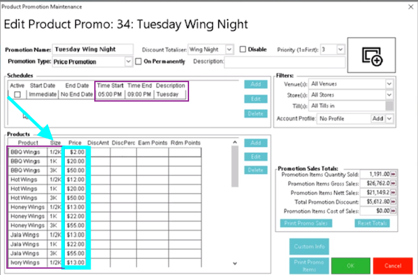 Under the Product Promotion Settings in BEPOZ, the operator may elect to set a promotion by opening a new promotion, giving it a âPromotion Nameâ, Promotion Type of âPrice Promotionâ, Schedule that applies exclusively to the dates and times the promotion runs, and adding all the Productsâ Sizes, Prices and/or Discount Amounts that apply. For all items included in the promotion the discount may apply at checkout for Guests or any Members who are not entitled to a better price through their membership.