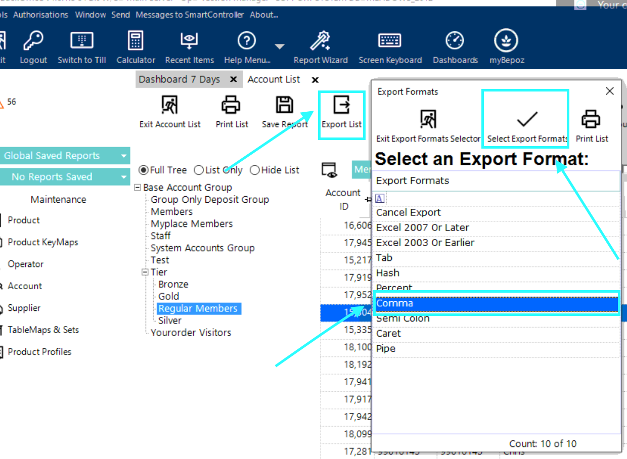Once the desired list displays after clicking the âExport Listâ tile, the operator can select the Comma list item under Export Formats and then click on the âSelect Export Formatâ tile to save the file.