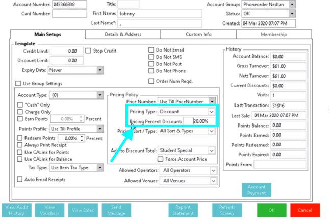 In the Pricing Policy section under Account Settings in BEPOZ, the operator may elect to set the âPricing Typeâ field to Discount and the âPricing Percent Discountâ to the preferred percentage value off for the member. If this member price offers the member the lowest price of all running discounts/promotions in BEPOZ then YourOrder will apply a 20% discount to the cart items for that member as soon as the member has logged in and clicks the checkout button.