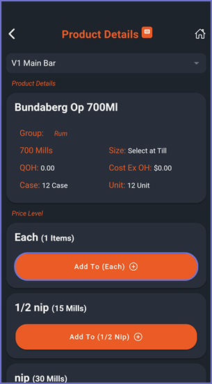 - In the Product Details screen, the Operator must choose a Size to which barcode must be attached by selecting the Add to Each button