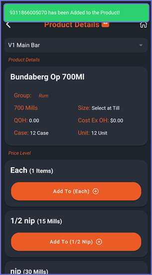 - After a Yes selection, a green notification bar appears on top of the screen with the message that the barcode has been added to the product