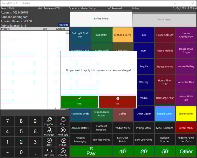 - Log into SmartPOS, open the relevant user account and proceed to process an account payment.