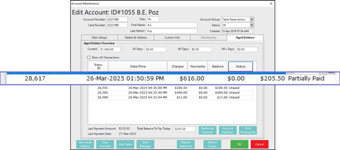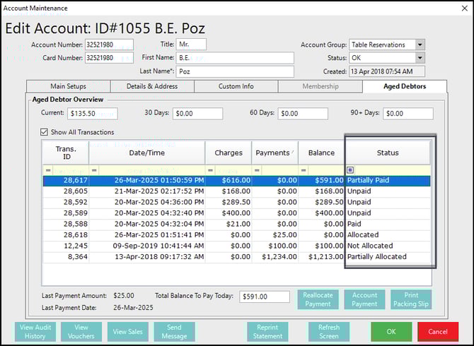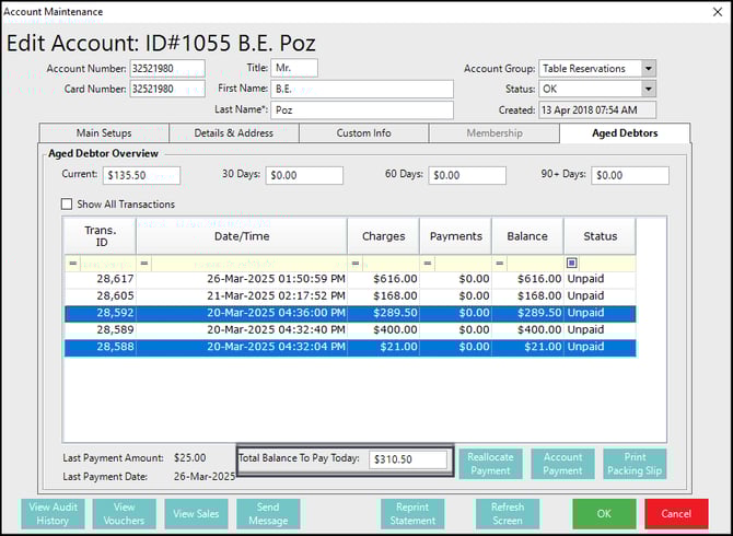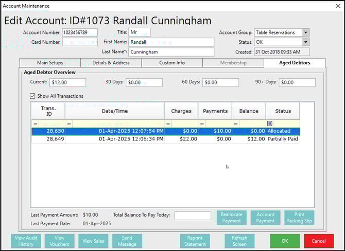 There are two transaction types for Aged Debtors: Account Charges and Account Payments.