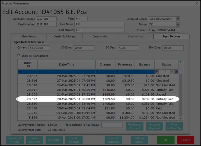 As shown in the screenshot, transactions marked as 'Paid' or 'Allocated' have a zero balance, indicating full usage of the balance. Conversely, 'Partially Paid' or 'Partially Allocated' transactions have a balance that differs from the total, signifying partial usage. Transactions labeled as 'Not Allocated' or 'Unpaid' will have a balance that matches the 'Charge' or 'Payment' amount.