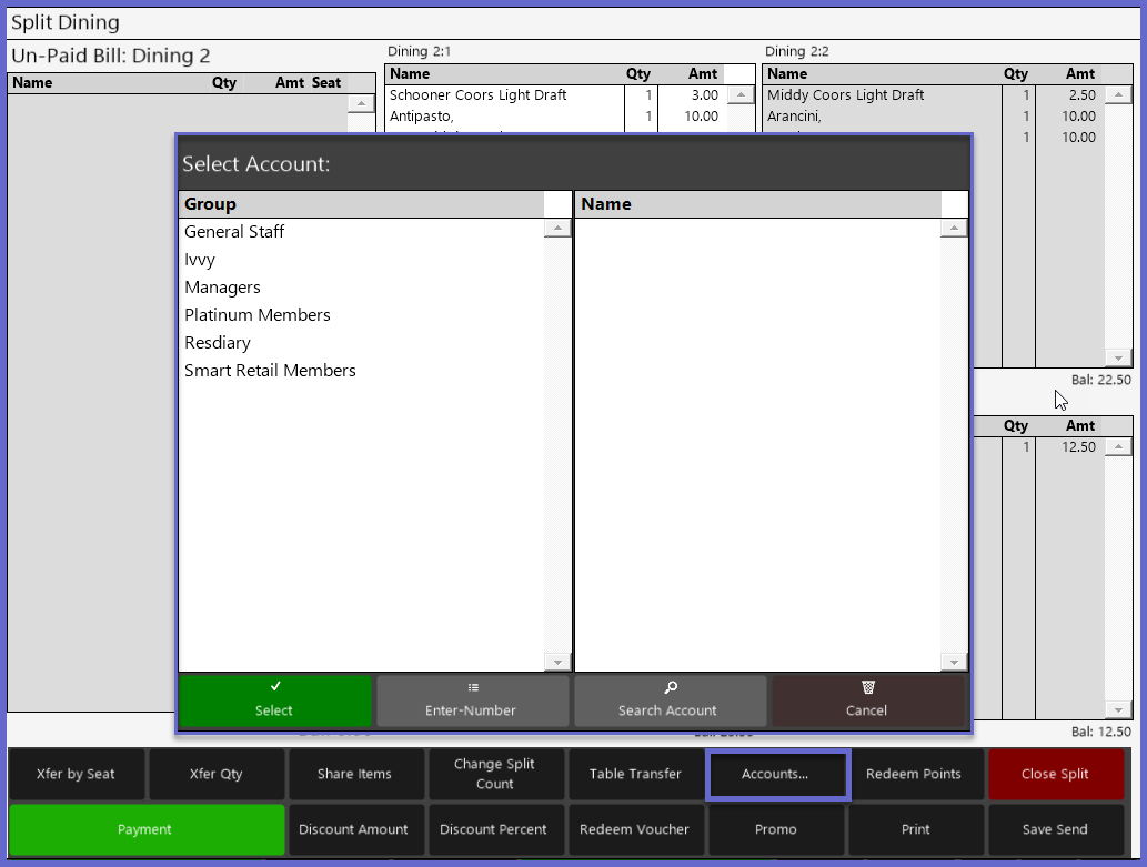 An Account can be attached to a Split using the Account Function button. This Function will display the Account List allowing the Operator to attach an Account to a Split. The Account can then Tender Payment for their Split using an Account Charge or by Redeeming Points.