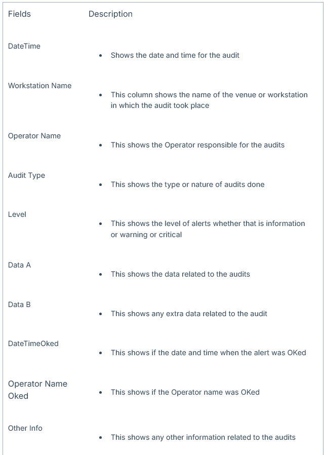- Audit Data A, Audit Data B, and Audit Other Info can be configured via BackOffice and Custom Audits can also be maintained