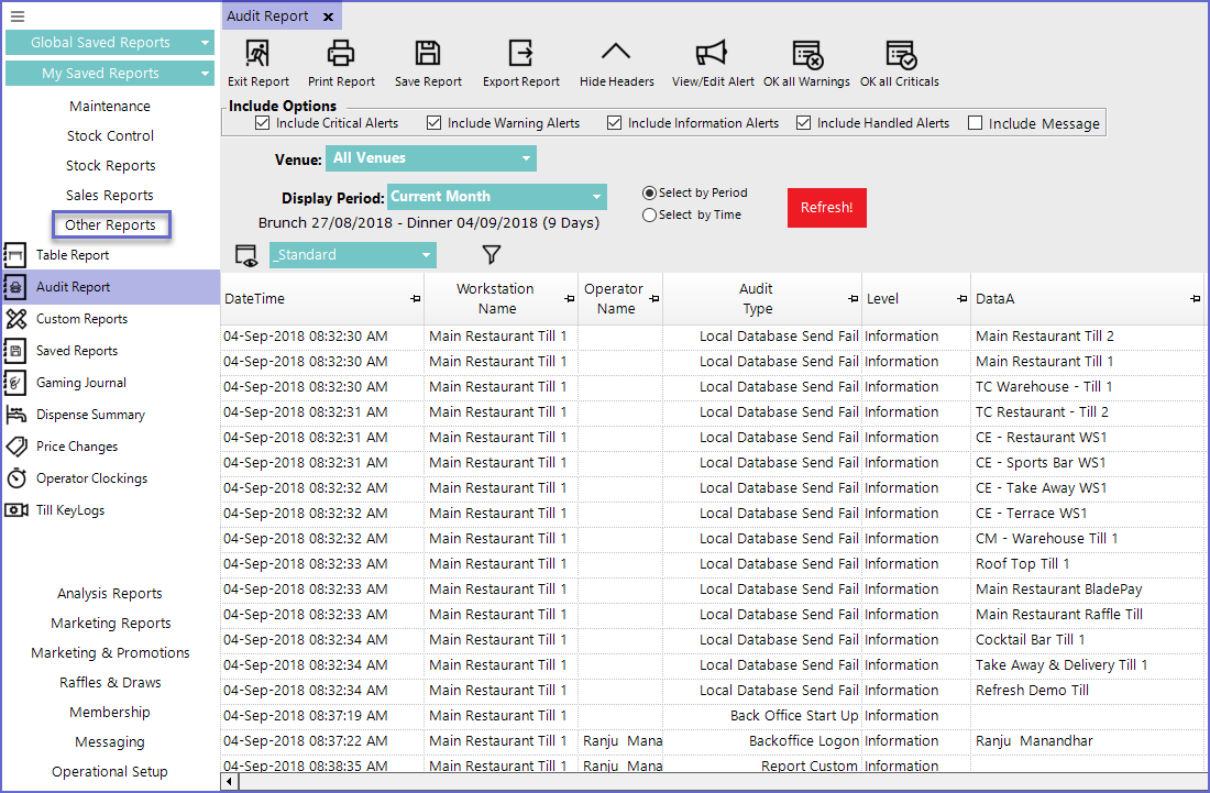 Activities that can be viewed and monitored in the Audit Report include: Venue, Stores, Products edits; Scheduled Job initiations; TIll logon access; and Software and Version updates.