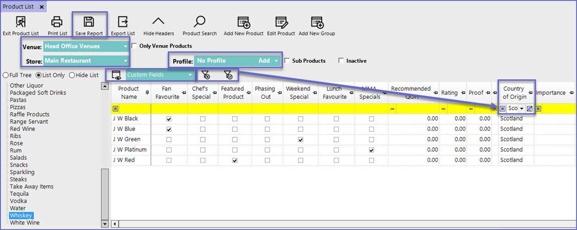 For example, if the following Report is saved, anytime the Saved Report is run, it will display Products belonging to the Product Group called "Whiskey" within the selected Store of the selected Venue which meet "No Profile"; and, it will show the information contained in the View called "Custom Fields" and the Products filtered where "Scotland" equals the text in the Custom Field called "Country of Origin"