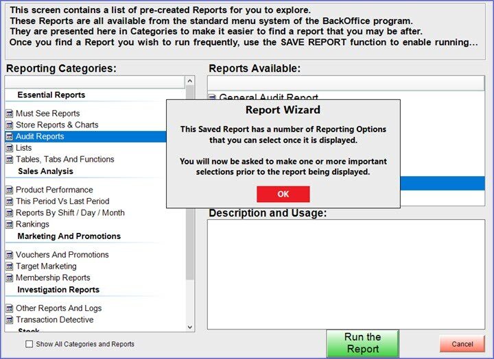 A Report can be built in various Maintenance, Stock Control, Marketing & Promotions, Raffles & Draws, Memberships, and Messaging components by selecting from available fields, drop-down options, and views.