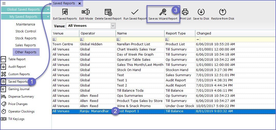 By configuring and combining drop-down options such as Venues, Stores, Profiles, Periods, Views, etc. and a Filter - this allows an enormous variety of options for saving all sorts of reports