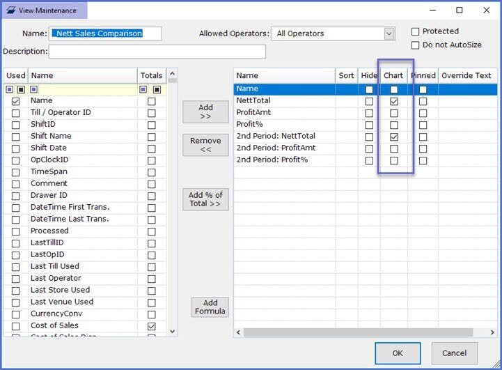 • When charting data, BackOffice will look at the View currently selected, and Chart the columns in the view that have the Chart flag turned on