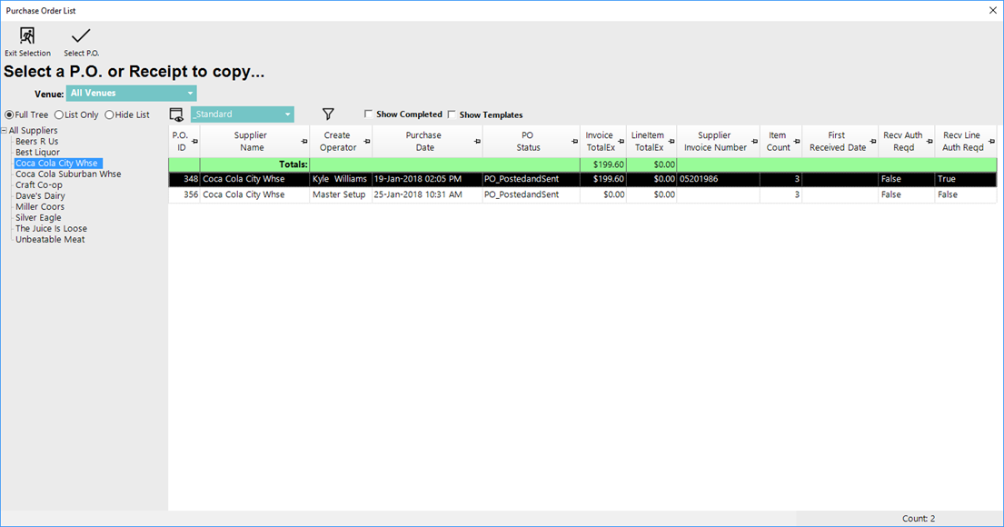 • A window will open which will display existing Purchase Orders and Receipts to copy
