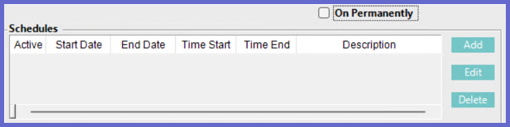 - Delete: First choose an existing schedule in the schedules list. When the Delete button is clicked the selected schedule will be removed