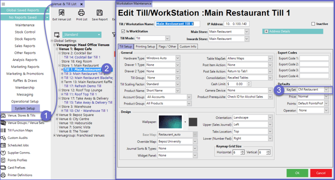 - In the Till/Workstation Maintenance window that opens, select the desired KeySet from the Defaults KeySet drop-down selector