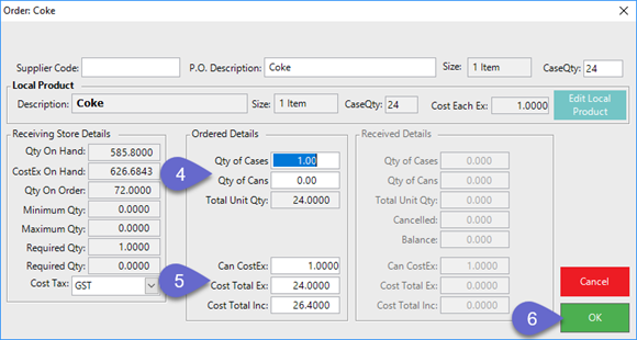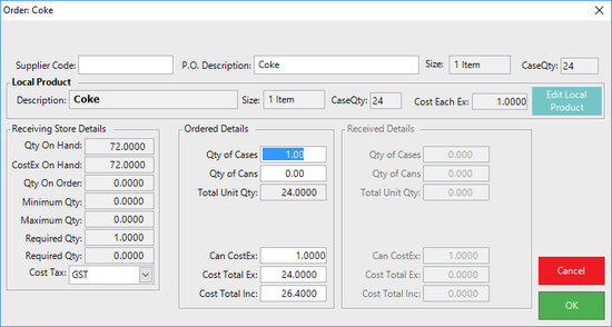 - If OK is selected, the Product Order window will open, allowing the Operator to edit the existing quantity