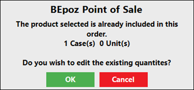 - If a Product is selected to be added to a PO that has already been added, a message prompt will appear informing the Operator that the Product is already included on the Purchase Order; the message will include the quantity being ordered