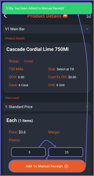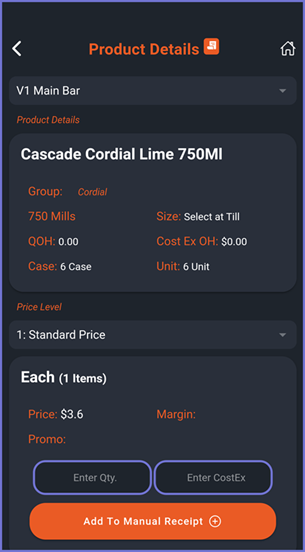 • Proceed to add a Quantity and CostEx for the selected product in the 'Enter Qty' field & 'Enter CostEx' field within the Price Level card and click on the 'Add to Manual Receipt' button