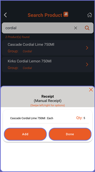 • Once the Venue, Store & Supplier are selected, click on the 'Receipt' button at the bottom to navigate to the Product Search page to add Products to the Manual Receipt