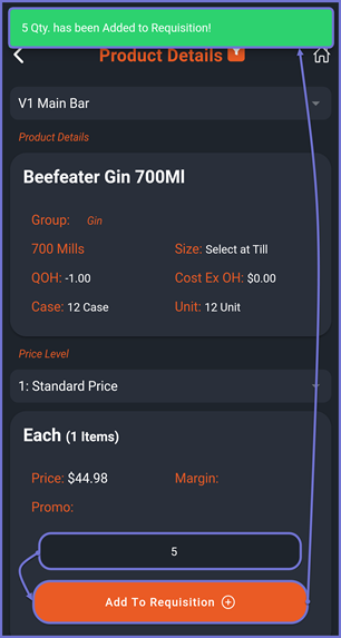 - Proceed to add a quantity for the selected product in the 'Enter Qty' field within the Price Level card and click on the 'Add to Requisition' button