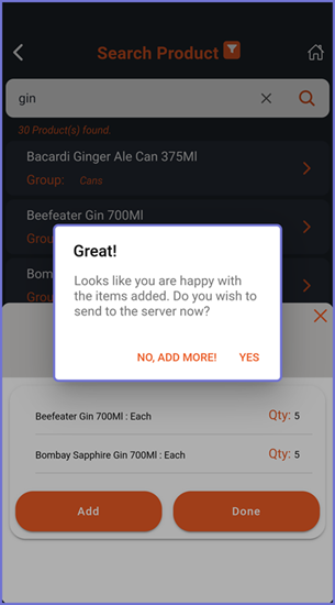 - Once the Operator clicks on Done, the app prompts with a Yes and No, Add More selection