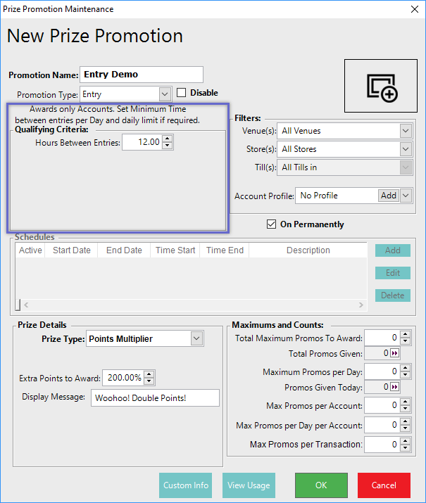 - If desired, limit the number of Prizes allowed each day using the Max Promos per Day per Account field in the Maximums and Counts section