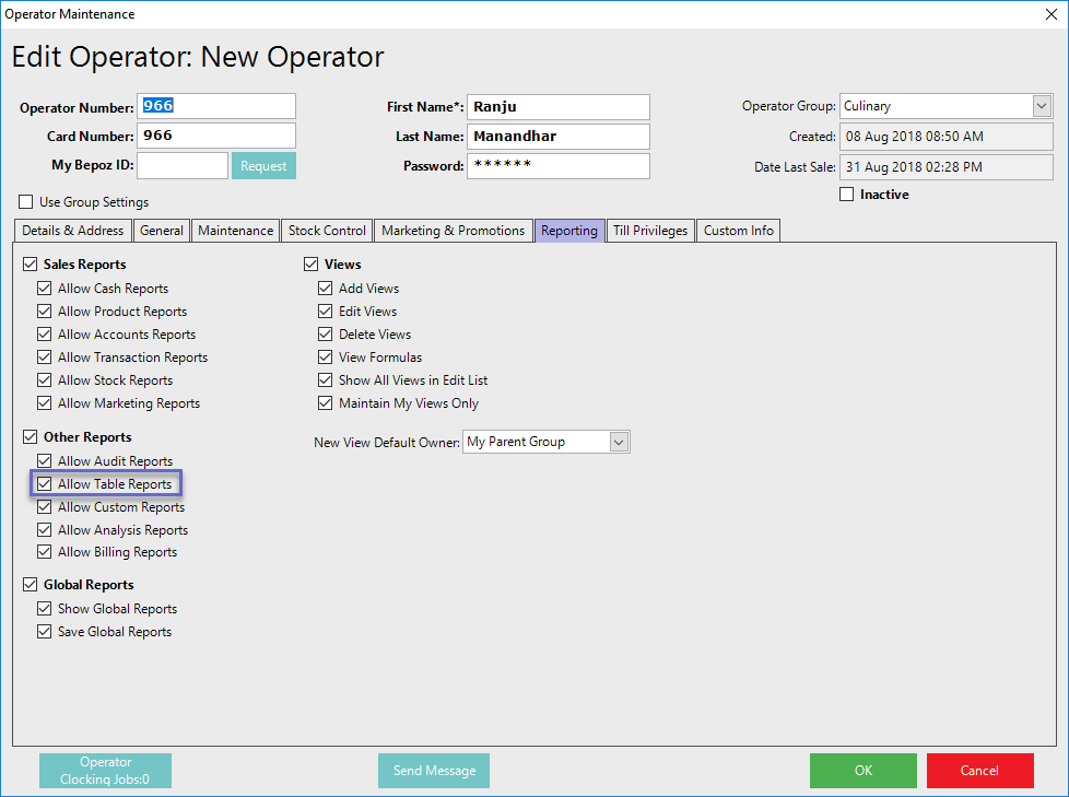 - For an Operator to be able to access and run Table Reports within BackOffice, the Allow Table Reports flag within the Reporting tab of Operator Maintenance must first be enabled
