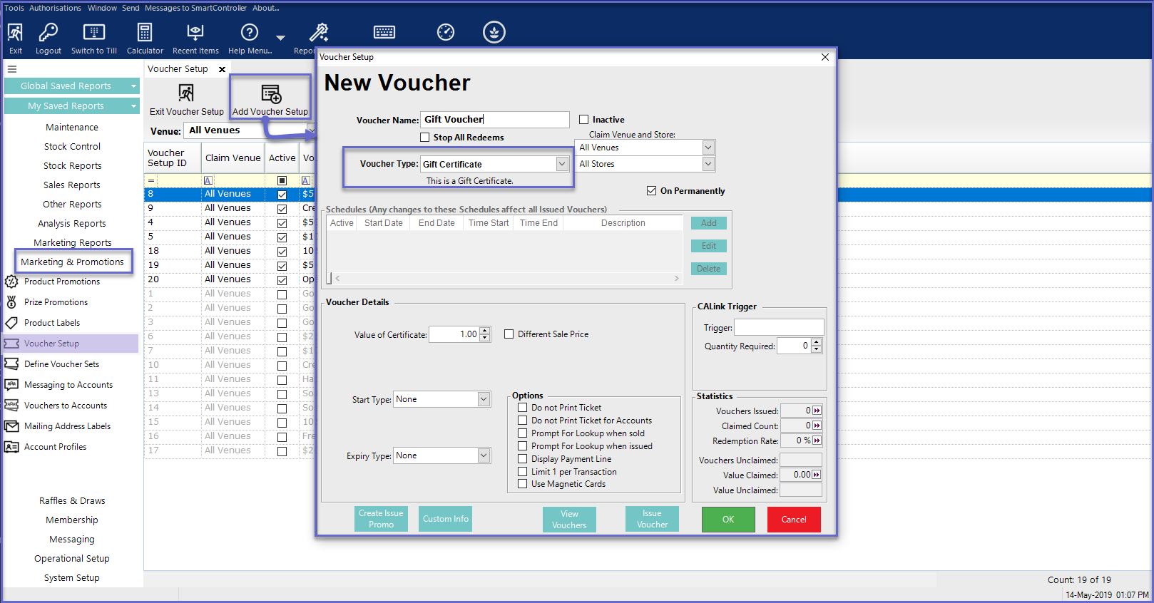 - To Create a Gift Voucher setup, go to Marketing & Promotions > Voucher Setup