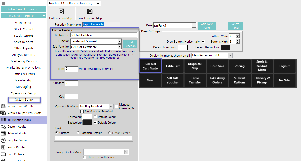 - Once the Gift Certificate Voucher Setup has been created, a function to sell these Vouchers has to be configured in the Till Function Map