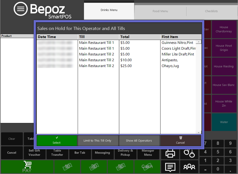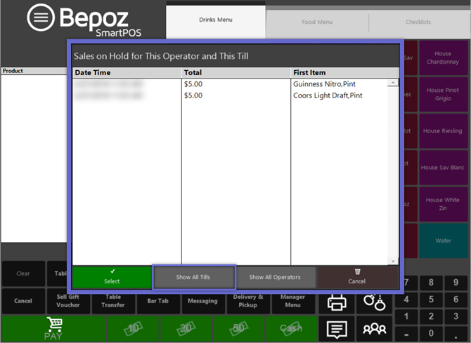 - When an Operator with Held Sales logs in to a SmartPOS Workstation, the default "Sales on Hold for This Operator and All Tills" window will display