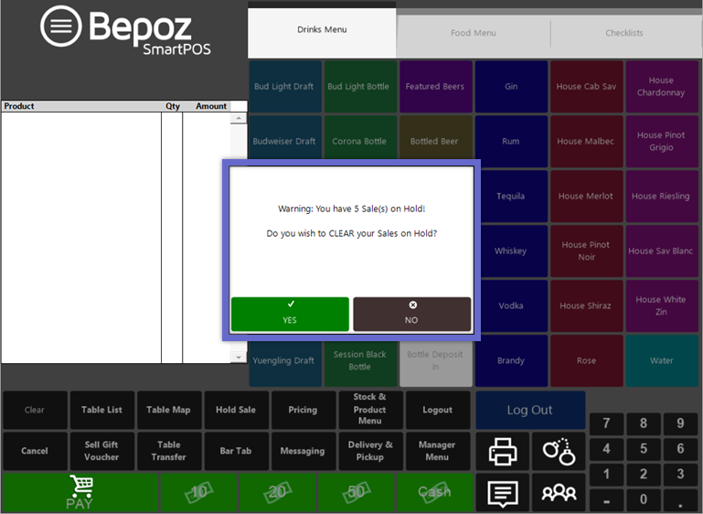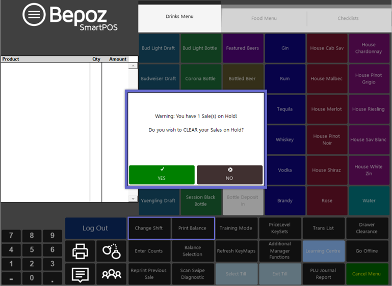 - When a Sale/s on Hold is Cleared by completing a Shift Change or Print Balance function and selecting Yes from the warning prompt to proceed with the function