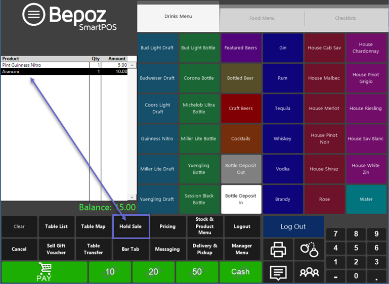 For example, a Bartender waiting on a Guinness to settle before Finalizing the Transaction with a guest can begin serving another guest in the meantime by placing the original Guinness Transaction on hold.
