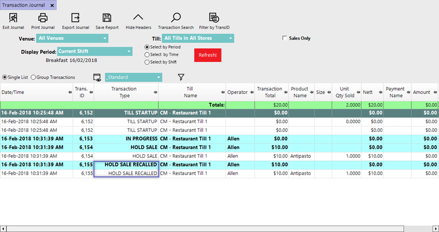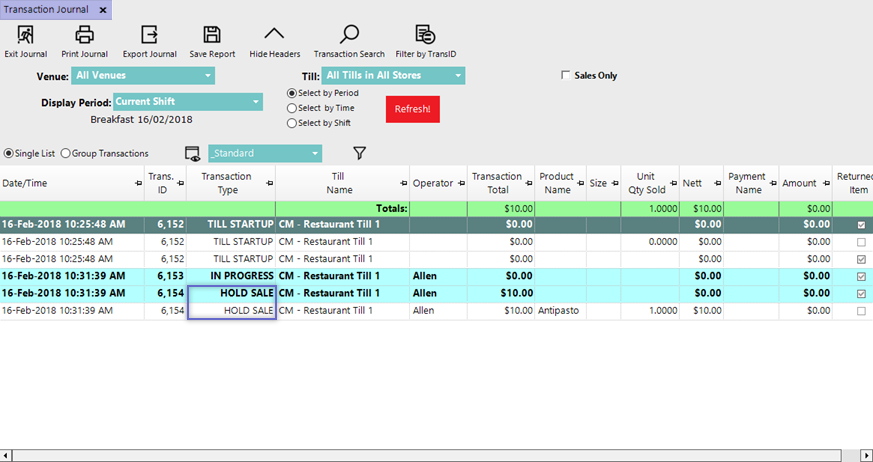 - When a Sale is placed on Hold, it will appear in the Transaction Journal with the Transaction Type of Hold Sale