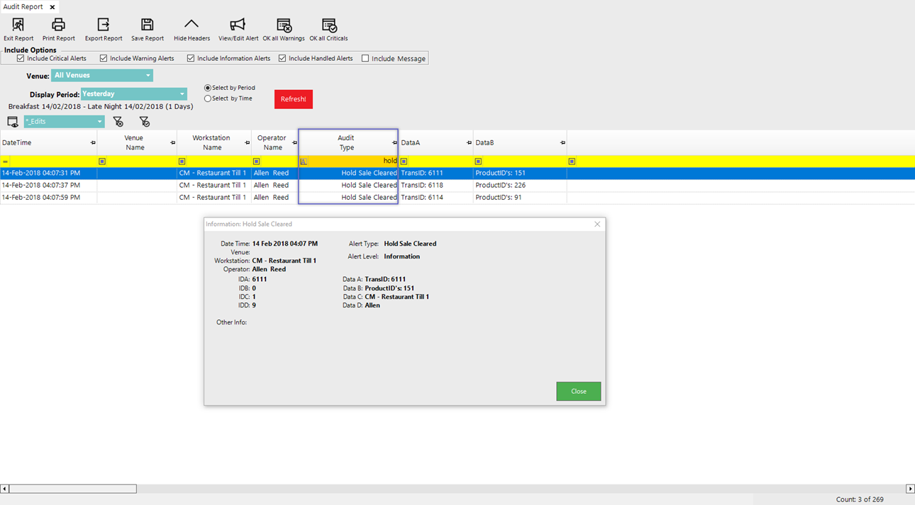 - This Audit will not be created if the Hold Sale is re-opened first by selecting Yes from the prompt, but then Cleared using the Clear function; i.e., the Audit is only created when the Hold Sale is Cleared via selecting No from the Hold Sale Alert prompt