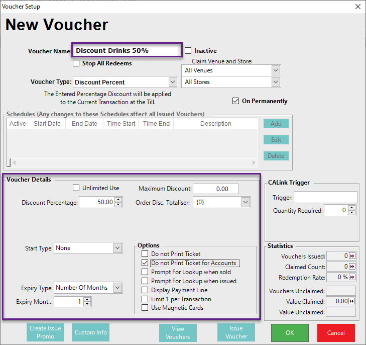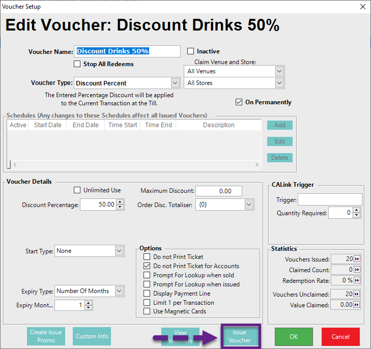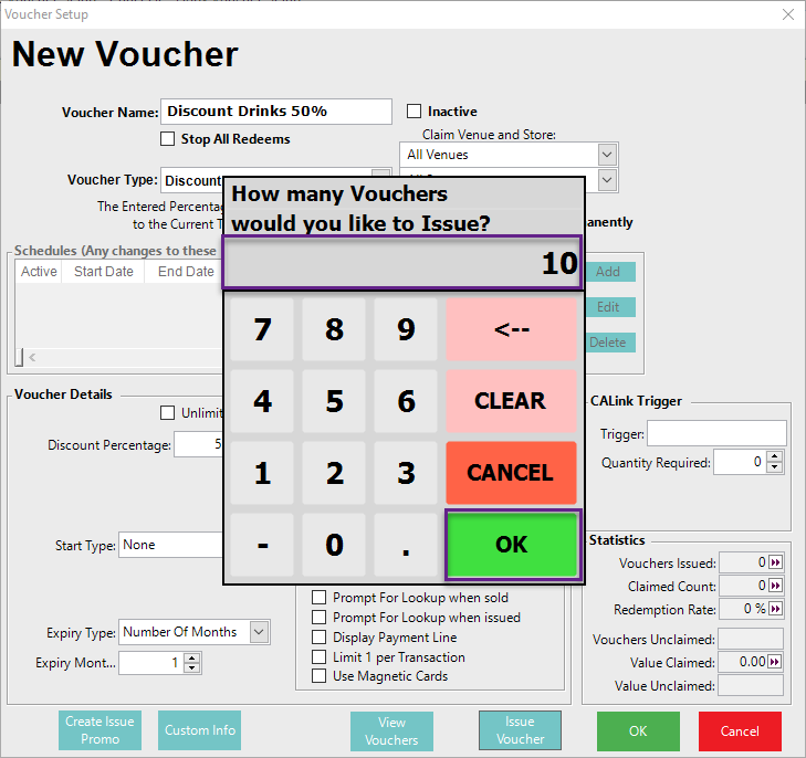 - Enter the number of vouchers you would like to issue for this Voucher Setup and click OK