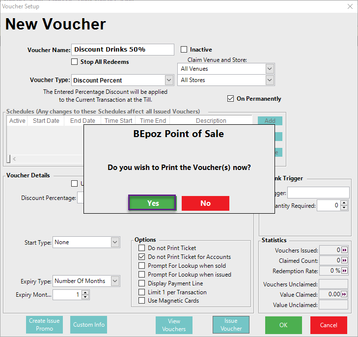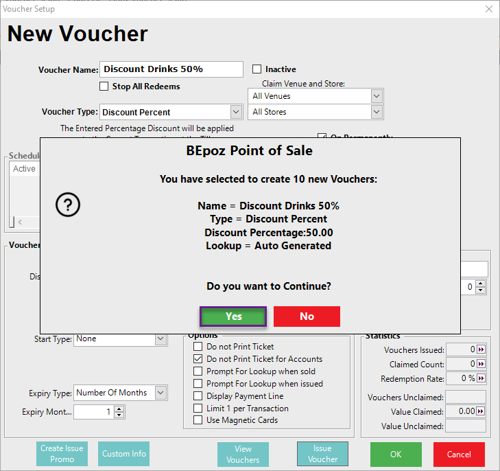 - The next prompt that will appear is a confirmation prompt giving you an overview of your Voucher Setup; if the criteria are correct click "YES"