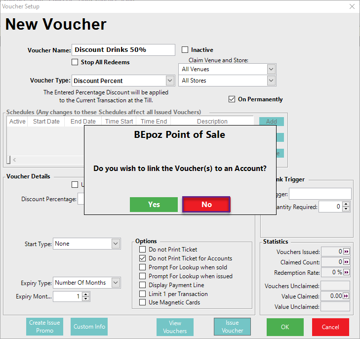 - This gives you the choice to link the issued vouchers to an account if required, in this case, this option is not required so click "NO"