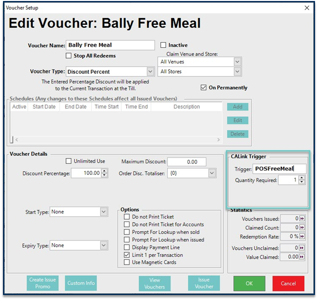 - We can map them on the basis of the value entered into the āCALink Triggerā section of a Voucher Setup; in the example here, it matches using the Trigger āPOSFreeMealā