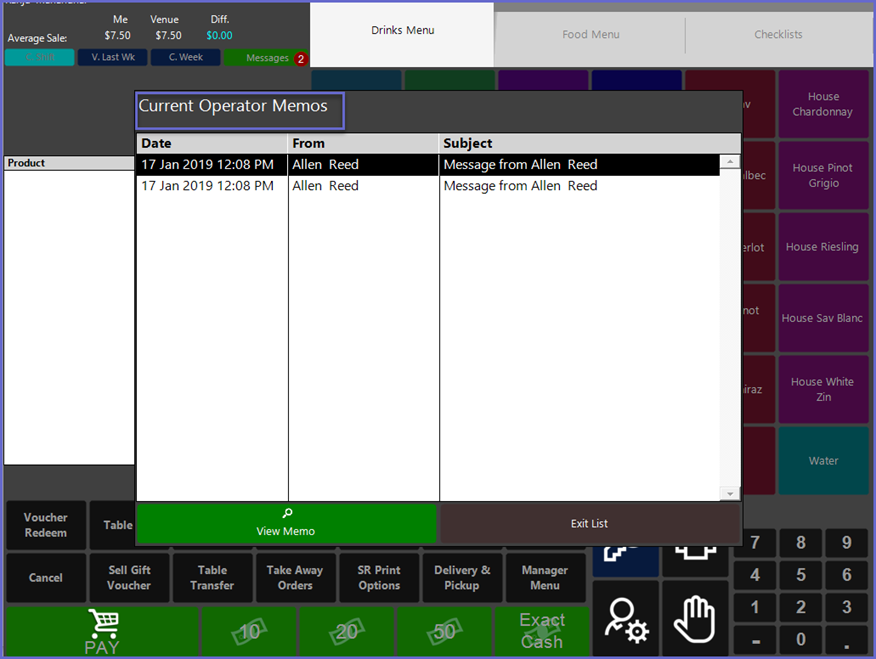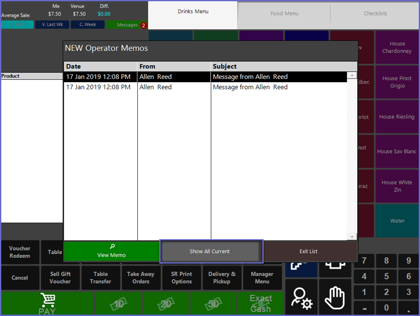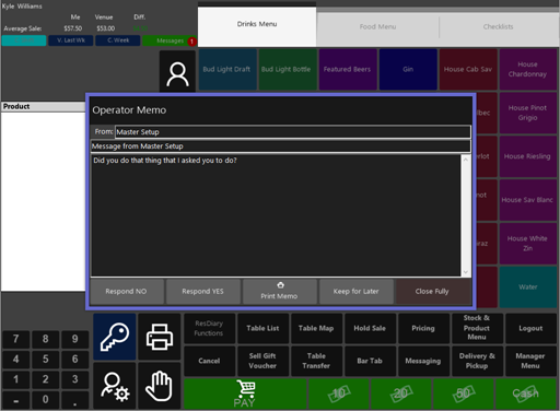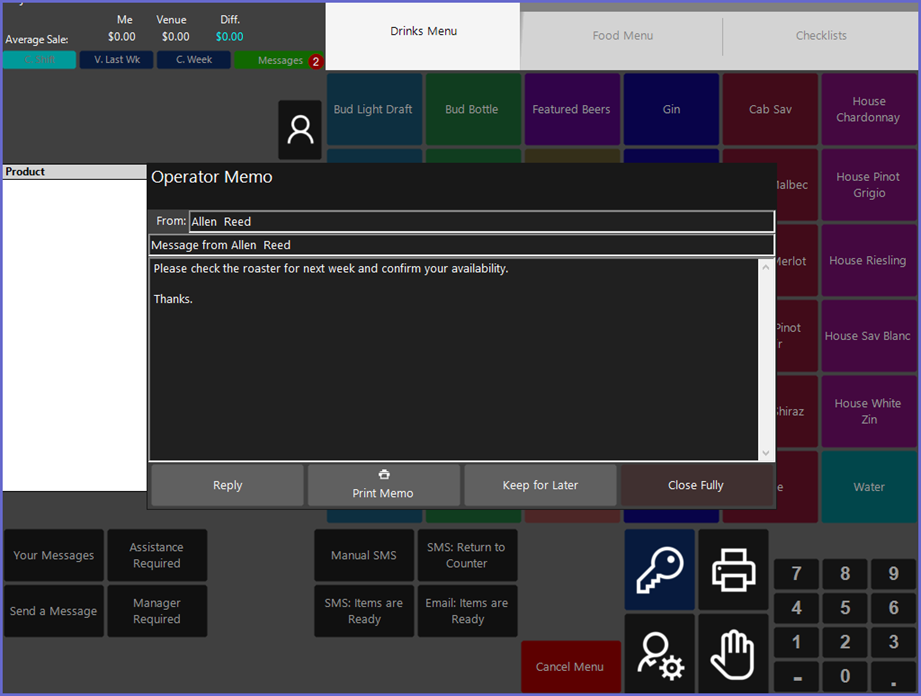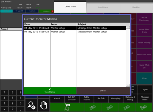 Operators are able to send and receive Messages and Memos through SmartPOS Workstations. New queued Memos will appear when an Operator Logs On to a Workstation.