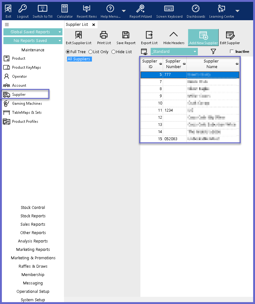 • To access the "Supplier" Maintenance Menu, the following Operator Privileges will need to be enabled